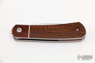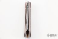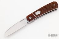 This Apache Front Flipper by Enrique Pena features a hand rub satin finished blade with notched thumbrest/front flipper. The handle has natural canvas micarta bolsters, brown burlap micarta covers with white liners, titanium liners and natural canvas micarta backspacer. Excellent condition.