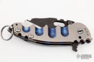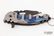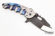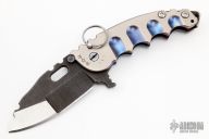 This Man of War flipper by TS Heeter features a multi ground blade with notched thumbrest, thumbhole and flipper. The handle has an anodized titanium frame with tip up reversible titanium clip, black oxide finished 3V steel backspacer. Has a pin with split ring that can be used to lock the blade open, or it can be removed to reveal a lanyard hole. Nice detent, lockup and blade seating. Has a couple light scratches, otherwise excellent condition. Includes a original box and COA dated 10-5-16