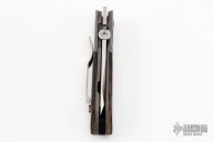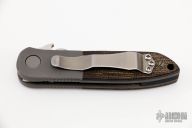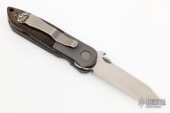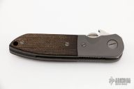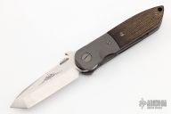 This Custom CQC-5 by Ernie Emerson features a satin finished tanto chisel ground blade with thumbdisc, wave feature and notched thumbrest. The handle has bead blasted and dovetailed titanium bolsters, domed pivot, green canvas micarta scales, bead blasted titanium liners, black G-10 backspacer, tip up stainless steel clip, bead blasted screws. Nice detent, lockup and blade seating. Comes with original box. From 2021 Blade Show West. Excellent condition.