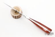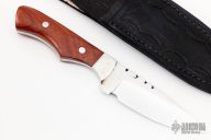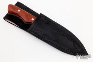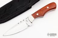 This Hunter by Wayne Hensley features a mirror polished blade with fileworked spine, .119" blade stock and 1.301" blade depth, full tang construction. The handle has stainless steel bolsters, paddock wood scales with white liners and stainless steel pins. Comes with a hand tooled black leather sheath. New from maker.