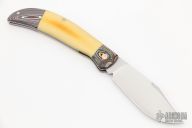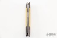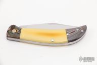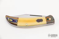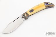 This Slipjoint by Dr. T features a clip point blade with a hand-rubbed satin finish and nail nick. The handle has Corvette Fordite bolsters, Westinghouse paper micarta covers with Corvette Fordite escutcheon, stainless steel liners and spring. Comes with a leather sheath. Has a couple light scratches, otherwise excellent condition.