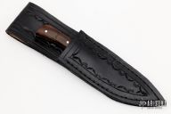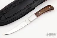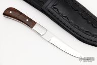 This Bird Knife by Wayne Hensley features a mirror polished blade with .140" blade stock and .659" blade depth, full tang construction. The handle has stainless steel bolsters, ironwood scales with stainless steel pins. Comes with a hand tooled black leather sheath with zippered case. New from maker.