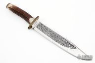 This Trail Master bowie by Cold Steel features a satin finished clip point blade with a false top edge, .289" blade stock and 1.501" blade depth, hidden tang construction. The handle has an engraved brass guard and butt with a stag grip. The blade has been engraved with scrolls and deeply engraved windows with images of animals by Bruce Shaw. Comes with a zippered case. Has some light scratches and some oxidation spots on the blade, otherwise good condition.