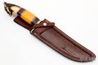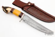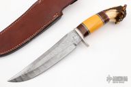 This Bowie by Colin Cox features a Damascus blade with a sharpened top edge, .227" blade stock and 1.755" blade depth, hidden tang construction. The handle has a nickel silver guard, crown stag butt with a nickel silver pin, bone linen micarta center, and spacer patter consisting of black, nickel silver, ironwood, white. Comes with a brown leather hand tooled sheath with ostrich leg skin inlay. Has some oxidation spots on the blade, otherwise excellent condition.