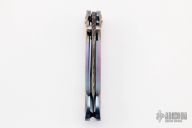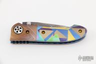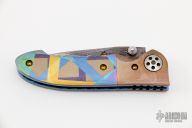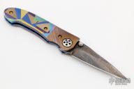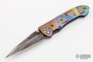 This linerlock by Allen Elishewitz features a Damascus blade with a dual thumbstuds. The handle has colored Damascus bolsters, anodized titanium scales, gold-plated screws, anodized titanium liners and black barrel spacers. Strong lock up, nice detent and blade seating. Excellent condition. Comes with original nylon sheath.