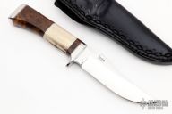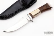 This hunter by George Cousino features a mirror polished upswept blade with .195" blade thickness and 1.267" blade depth, hidden tang construction. The handle has a stainless steel guard and butt, stag and walnut burl grip with black/stainless steel spacers. Comes with a hand tooled black leather sheath. #918 on blade. Excellent condition.
