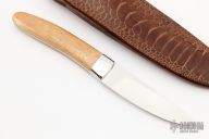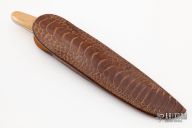 This hunter by Tinus Beukes features a hand rub satin finished blade, .126" blade stock .898" blade depth, full tapered tang. The handle has polished stainless steel bolsters, giraffe bone scales. Comes with a brown leather sheath with ostrich leg skin overlay. Excellent condition.