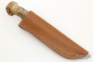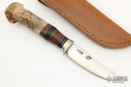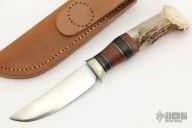 This Early Hunter by Mike Malosh features a crown stag grip with black/brass/leather spacers, brass guard and satin finished convex ground blade with .162" blade stock and .949" blade depth, hidden tang construction. Includes a brown leather sheath. Excellent condition.