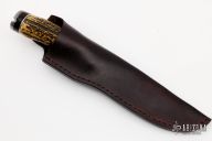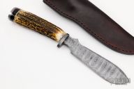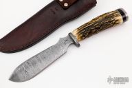 This Camp Knife from Stek Knives features a Damascus blade with false top edge, .225" blade stock and 1.521" blade depth, hidden tang construction. The handle is comprised of a Damascus guard, stag grip and buffalo and nickel silver spacers with a Damascus pommel. Includes a black leather sheath. Excellent condition. Dated 2000 on blade.