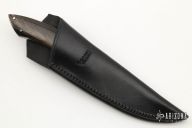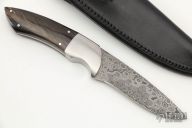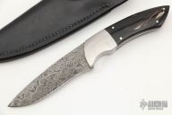 This hunter by Beretta features a Rain Drop Damascus blade with .122" blade stock and 1.055" blade depth, full tapered tang construction. The handle has dovetailed stainless steel bolsters and buffalo horn scales. Comes with a black leather sheath. Has some light scratches, otherwise excellent condition.