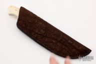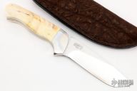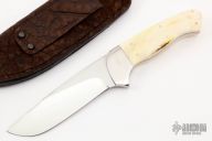 This knife by George Muller features a mirror finished blade with .151" blade stock and 1.158" blade depth, full tapered tang construction. The handle has nickel silver bolsters, warthog tusk scales with black liners. Comes with a brown leather sheath. Has a few light scratches, otherwise excellent condition.