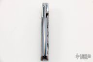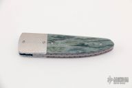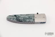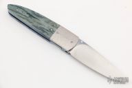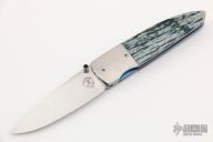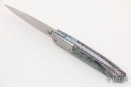 This Model LL9 linerlock folder by Andre Thorburn features a hand rub satin finished blade with a single thumbstud. The handle has stippled/engraved 304 stainless steel bolsters, giraffe bone scales with red liners, anodized titanium liners with fileworked spines, stainless steel backspacer. Smooth action with a nice detent, lockup and blade seating. Excellent condition. Comes with a leather pouch.