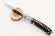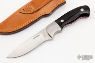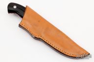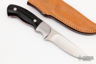 This knife by Jerry Hendrix features a hand rub satin finished blade with .165" blade stock and .992" blade depth, full tapered tang construction. The handle has dovetailed stainless steel bolsters, buffalo horn scales with red liners and file work along the full tang. Comes with a brown leather sheath. Excellent condition.