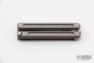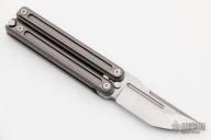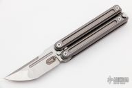 This Micro Parabellum Balisong by Darriel Caston features a satin finished blade with a false top edge. The handle is composed of bead blasted titanium. Includes original box and a leather sheath. New from maker.