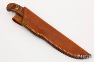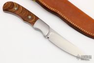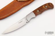 This Hunter by Ron Gaston features a hand rubbed satin finish blade with .164" blade stock and .883" blade depth, full tapered tang construction. The handle has a stainless steel dovetailed bolsters, wood scales with mosaic pins. Comes with a brown leather sheath. Has some light scratches, otherwise excellent condition.