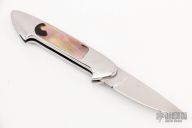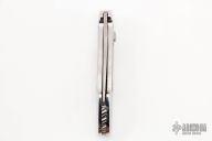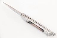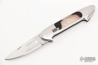 This Bolt Lock by Gil Hibben features a drop point mirror polished blade with nail nick. The handle has a polished stainless steel frame with black lip pearl inlays, fileworked stainless steel backspacer, checkered slide lock. #001 on the blade. Has some light scratches, otherwise good condition. Comes with a zippered case.