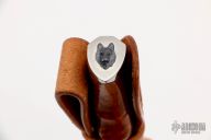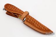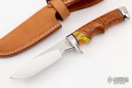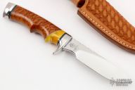 This Hunter by Ruffin Johnson features a mirror polish blade with fileworked spine, .164" blade stock, .920" blade depth, hidden tang construction. The handle has a mirror polished nickel silver guard and butt, amber and wood grip with black/white/aluminum spacers. Comes with a hand tooled brown leather sheath Wolf logo onset on butt. Excellent condition.