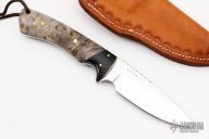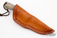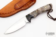 This hunter by RA Matt features a mirror polished blade with fileworked spine, .180" blade thickness and 1.341" blade depth, full tang construction. The handle has black dymondwood bolsters, burl wood scales with brass pins and blue liners, fileworked tang spine. Comes with a hand tooled brown leather sheath. Excellent condition.