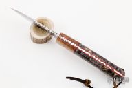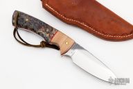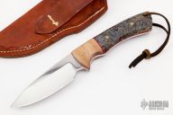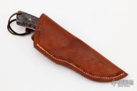This hunter by RA Matt features a mirror polished blade with fileworked spine, .179" blade thickness and 1.379" blade depth, full tapered tang construction. The handle has wood bolsters and wood scales with brass pins and red liners, fileworked tang spine. Comes with a hand tooled brown leather sheath. Excellent condition.