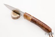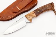 This hunter by RA Matt features a mirror polished blade with fileworked spine, .172" blade thickness and 1.388" blade depth, full tapered tang construction. The handle has burl wood bolsters and burl wood scales with brass pins and red liners, fileworked tang spine. Comes with a hand tooled brown leather sheath. Excellent condition.
