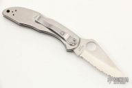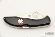 This C11S Delica from Spyderco has been modified by Santa Fe Stoneworks. It features a satin finished clip point serrated blade with thumb hole and notched thumb ramp. The "A" side of the handle is comprised of black jet and red jasper overlays over a steel frame. The stainless steel clip is reversible for tip up or tip down carry. Lanyard hole in pommel. Comes with original box. Excellent condition.