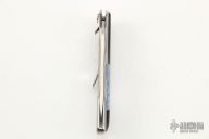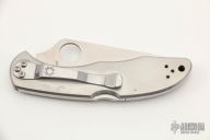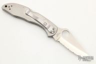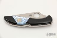 This C11S Delica from Spyderco has been modified by Santa Fe Stoneworks. It features a satin finished clip point serrated blade with thumb hole and notched thumb ramp. The "A" side of the handle is comprised of mother of pearl, black jet and denim web overlays over a steel frame. The stainless steel clip is reversible for tip up or tip down carry. Lanyard hole in pommel. Comes with original box. Excellent condition.