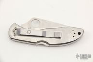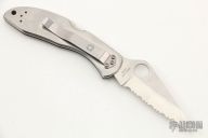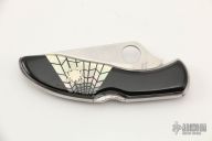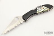 This C11S Delica from Spyderco has been modified by Santa Fe Stoneworks. It features a satin finished clip point serrated AUS6 blade with thumb hole and notched thumb ramp. The "A" side of the handle is comprised of gold lip pearl and black jet overlays over a steel frame. The stainless steel clip is reversible for tip up or tip down carry. Lanyard hole in pommel. Comes with original box. Excellent condition.