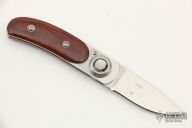 This Paul Pocket Knife features the Paul Poehlmann axial locking mechanism. Opens by depressing the button on the backside and rotating the face side dial. Closes the same way, rotating the dial in the opposite direction. The handle is comprised of rosewood scales over stainless steel liners and backspacer. Excellent condition. Includes original box, leather sheath.