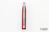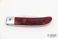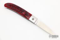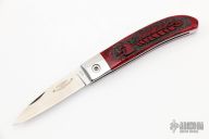 This Loveless City Knife has a satin finished drop point blade with nail nick. Handle is red jasper with stainless steel bolsters, liners, spring and lanyard hole. Comes with original box, sheath and papers. Excellent condition. Handle done by David Yellowhorse.