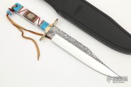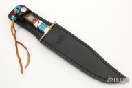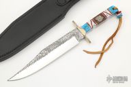This Bowie by Buck Knives features a mirror polished blade with Native Steel blade treatment by David Yellowhorse, .175" blade stock and 1.435" blade depth, full tang construction. The handle has a textured nickel silver guard, multi-piece scales by David Yellowhorse. Comes with original box, black leather sheath and COA #08 of 25. Excellent condition.