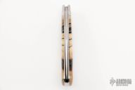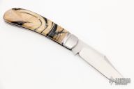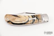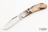 This Lanny's Clip slipjoint by David Taber features a hand rub satin finished blade with long nail nick. The handle has satin finished stainless steel fluted bolsters, stabilized cross-cut mammoth ivory covers, stainless steel liners and spring. Half stop blade position, flush in all positions. Strong function. Excellent condition. Comes with a zippered case.