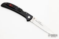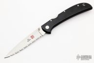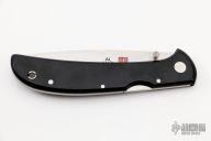 This Eagle Ultralight lock back by Al Mar Knives has a satin finish blade with dual thumb studs and serrations. Black linen micarta scales and a black pocket clip. Strong lock up. Comes with original box. Some minor scuffs and carry marks but otherwise great condition.