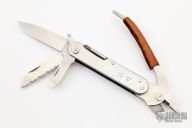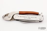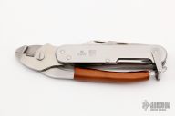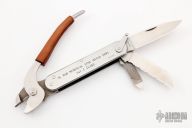 This 4x4 Tool Mate from Al Mark Knives features a drop point blade, a saw blade, nail file/pry bar combo and Phillips head screwdriver. Also includes pliers with a leather wrapped handle. Lanyard bail rotates over the plier handle to lock closed when not in use. Comes with leather belt sheath. Has some scratches, otherwise excellent condition.
