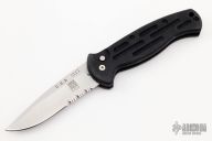 This AFO auto by Benchmade and Al Mar has a bead blast finished blade with partially serrated edge. Black anodized aluminum handle with a lanyard hole. Hard to find Benchmade/Al Mar version of this knife. Has scuffs and scratches, otherwise good functioning condition.