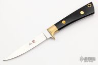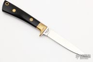 This 5002 Road Runner by Al Mar features a mirror polished drop point blade with notched thumbrest, .105" blade stock and .589" blade depth, full tapered tang construction. The handle has brass bolsters and black paper micarta scales with brass pins and lanyard hole. Has some light scratches, and patina otherwise great condition.