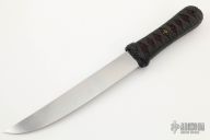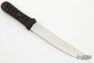 This Tanto by Master Smith Jason Knight was ground by his student "Shirey" and her name is included on the blade. It features a hand rub satin finished blade with hamon, .226" blade stock and 1.338" blade depth, hidden tang construction. The handle has black epoxied cord over burgundy stingray skin with brass turtle menukis. Excellent condition. Comes with a zippered case.