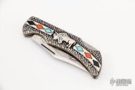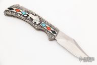 This "Sacred Buffalo" folder is a David Yellowhorse Premier Edition by United Cutlery. It features a satin finished clip point blade with swedge and nail nick. The blade is marked with his signature and logo. The handle is comprised of carved sterling silver with turquoise, black jet and orange piny oyster stone inlays over a steel lock back. Numbered 1885/2500. Includes original box and COA. Excellent condition.