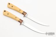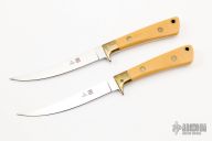 This 5003 Fisher by Al Mar features a mirror polished upswept blade with notched thumbrest, .119" blade stock and .577" blade depth, full tapered tang construction. The handle has brass bolsters and ivory paper micarta scales with brass pins and lanyard hole. Comes in box set with two knives. Has some patina and very fine scratches otherwise excellent condition.