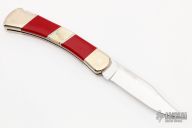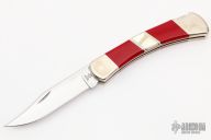 This Buck Model 110 features a mirror polished clip point blade with a single nail nick. The handle has a nickel silver frame with red coral/gold lip pearl/opal inlays. Includes box. Excellent condition.