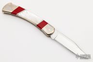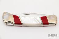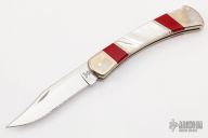 This Buck Model 110 features a mirror polished clip point blade with a single nail nick. The handle has a nickel silver frame with red coral/mother of pearl/opal inlays. Includes box. Has a few fine scratches, otherwise excellent condition.