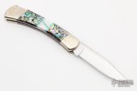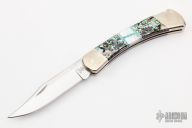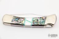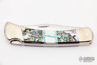 This Buck Model 110 features a mirror polished clip point blade with a single nail nick. The handle has a nickel silver frame with mother of pearl/opal/abalone inlays. Includes box. Has a few fine scratches, otherwise excellent condition.