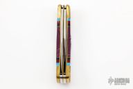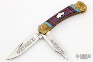 This Buffalo Custom Buck Model 110/112 has been customized by Brian Yellowhorse. The blades are satin finished with nail nicks. The 110 blade says "First Production Year Post Falls, ID" and the 112 blade says "Last Production Year El Cajon, CA" The handle features a brass frame with carved bolsters, with multi-piece scales. Includes a zippered case and COA. Excellent condition.