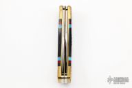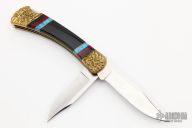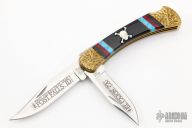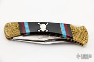 This Skull Custom Buck Model 110/112 has been customized by Brian Yellowhorse. The blades are satin finished with nail nicks. The 110 blade says "First Production Year Post Falls, ID" and the 112 blade says "Last Production Year El Cajon, CA" The handle features a brass frame with carved bolsters, with multi-piece scales. Includes a zippered case and COA. Excellent condition.