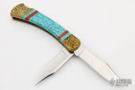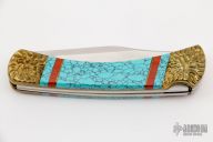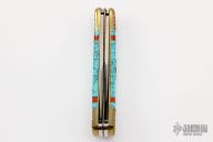 This Bass Custom Buck Model 110/112 has been customized by Brian Yellowhorse. The blades are satin finished with nail nicks. The 110 blade says "First Production Year Post Falls, ID" and the 112 blade says "Last Production Year El Cajon, CA" The handle features a brass frame with carved bolsters, with multi-piece scales. Includes a zippered case and COA. Excellent condition.
