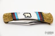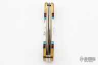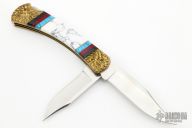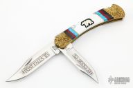 This Grizzly Bear Custom Buck Model 110/112 has been customized by Brian Yellowhorse. The blades are satin finished with nail nicks. The 110 blade says "First Production Year Post Falls, ID" and the 112 blade says "Last Production Year El Cajon, CA" The handle features a brass frame with carved bolsters, with multi-piece scales. Includes a zippered case and COA. Excellent condition.