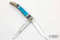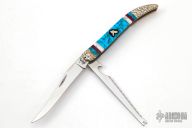 This Custom Fishing Knife by Case Knives has been customized by Brian Yellowhorse features a mirror polished blades with nail nicks. The handle has carved nickel silver bolsters, multi-piece covers, brass liners, stainless steel spring. Comes with original box and papers. Excellent condition.