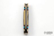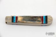 This Custom 2-Blade Trapper by Case has been modified by Brian Yellowhorse. It features two mirror polished blades both with nail nicks. The handle has carved nickel silver bolsters, multi-piece covers with mammoth ivory, brass liners and stainless steel springs. Comes with original box. Excellent condition.