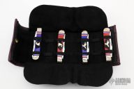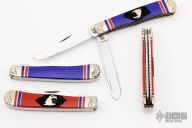 These Custom 2-Blade Trappers by Case has been modified by Brian Yellowhorse and are all #2 of 5. They feature two mirror polished blades both with nail nicks. The handles have carved nickel silver bolsters, multi-piece covers, brass liners and stainless steel springs. Comes with a leather Case Knives roll up. Excellent condition. I think there were supposed to be 6 knives in this set and it is missing the two with white covers.
