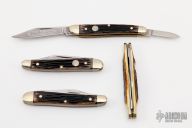 This set is 4 Model 240 GBC 2-Blade Slipjoints by Boker. Mirror polished blades, nickel silver bolsters, jigged bone covers, brass liners, stainless steel spring. Comes with boxes and papers. Excellent condition.