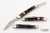 This set is 3 Model 240 GBC 2-Blade Slipjoints by Boker. Mirror polished blades, nickel silver bolsters, jigged bone covers, brass liners, stainless steel spring. Comes with boxes and papers. Excellent condition.